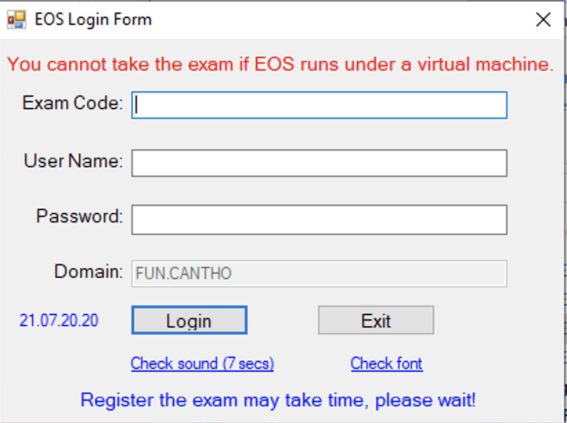 - Không được chạy win ảo trên Mac dùng các tool: VirtualBox, Parallel, VMFusion,… Nếu chạy EOS trên win ảo sẽ không đăng nhập được vào đề thi.