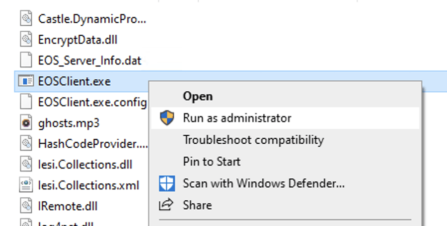 Click chuột phải file EOSClient.exe (hoặc EOSClient nếu máy ẩn phần mở rộng tên file) và chọn Run as Administrator (hoặc Chạy với tư cách Quản trị viên nếu windows tiếng Việt)