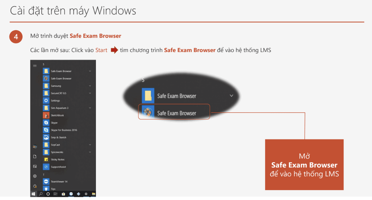 - Để mở SEB: Bấm phím Windows vào menu Start, gõ Safe Exam Browser
