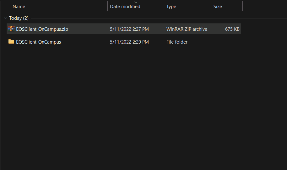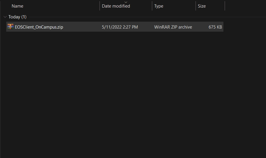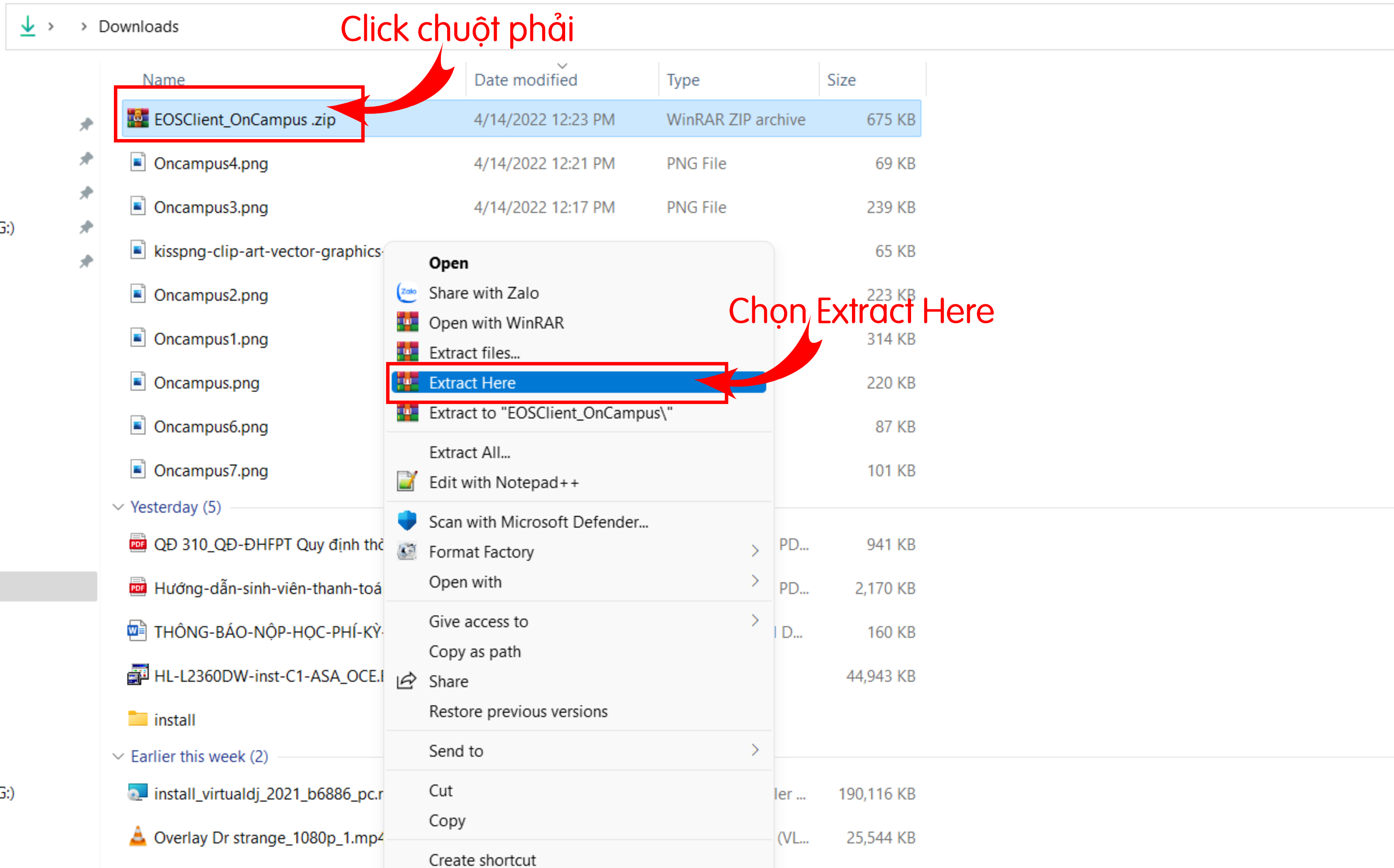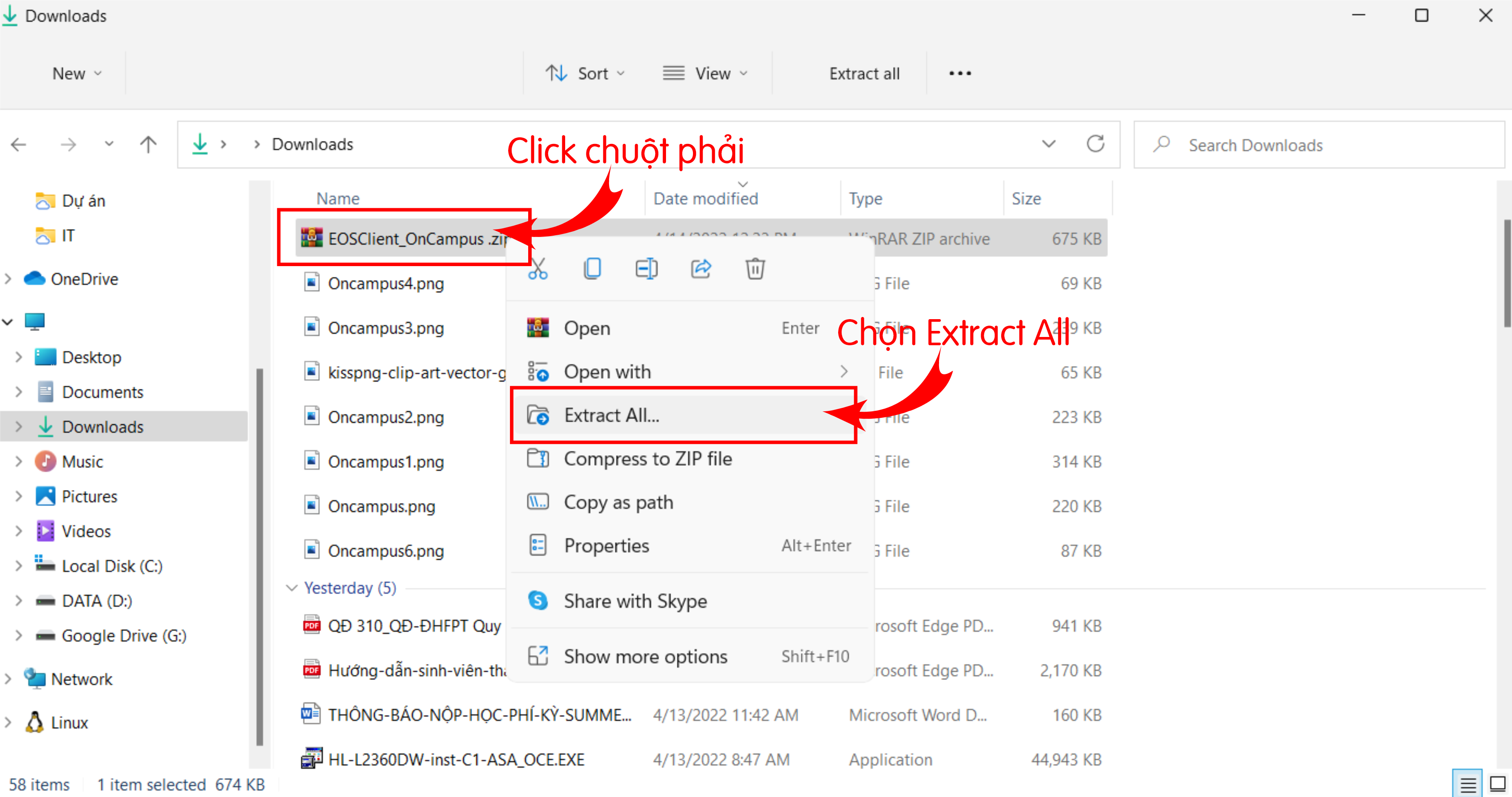 Trên máy tính hiện thư mục chứa file nén .zip vừa tải, bấm chuột phải vào file EOSClient_OnCampus.zip vừa tải, chọn Extract All