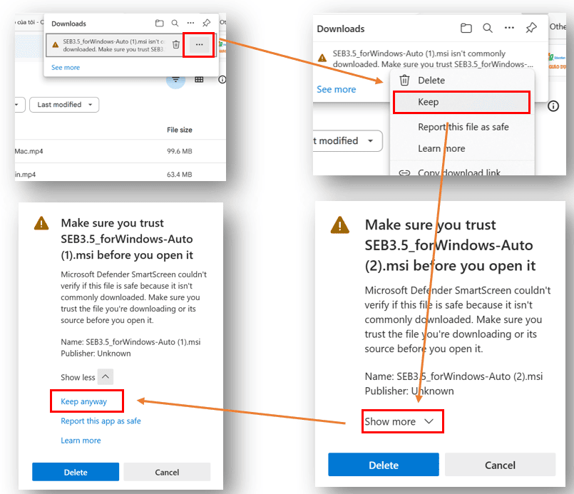 Lưu ý: nếu trình duyệt chặn tải file, click chuột vào nút “…” bên cạnh file vừa tải, chọn Keep