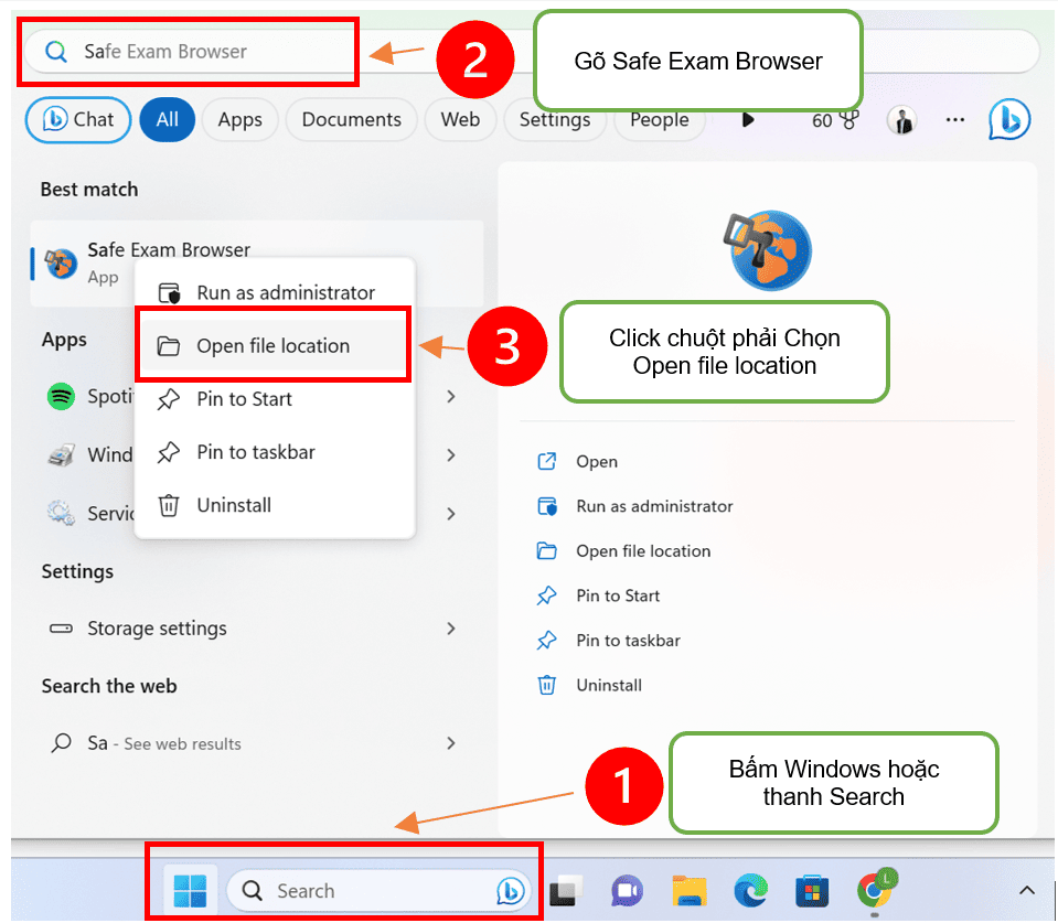 - Để tạo Shortcut ra màn hình Desktop: thực hiện thao tác tìm kiếm như trên, sau đó bấm chuột phải vào App Safe Exam Browser tìm thấy trên màn hình, chọn Open file location