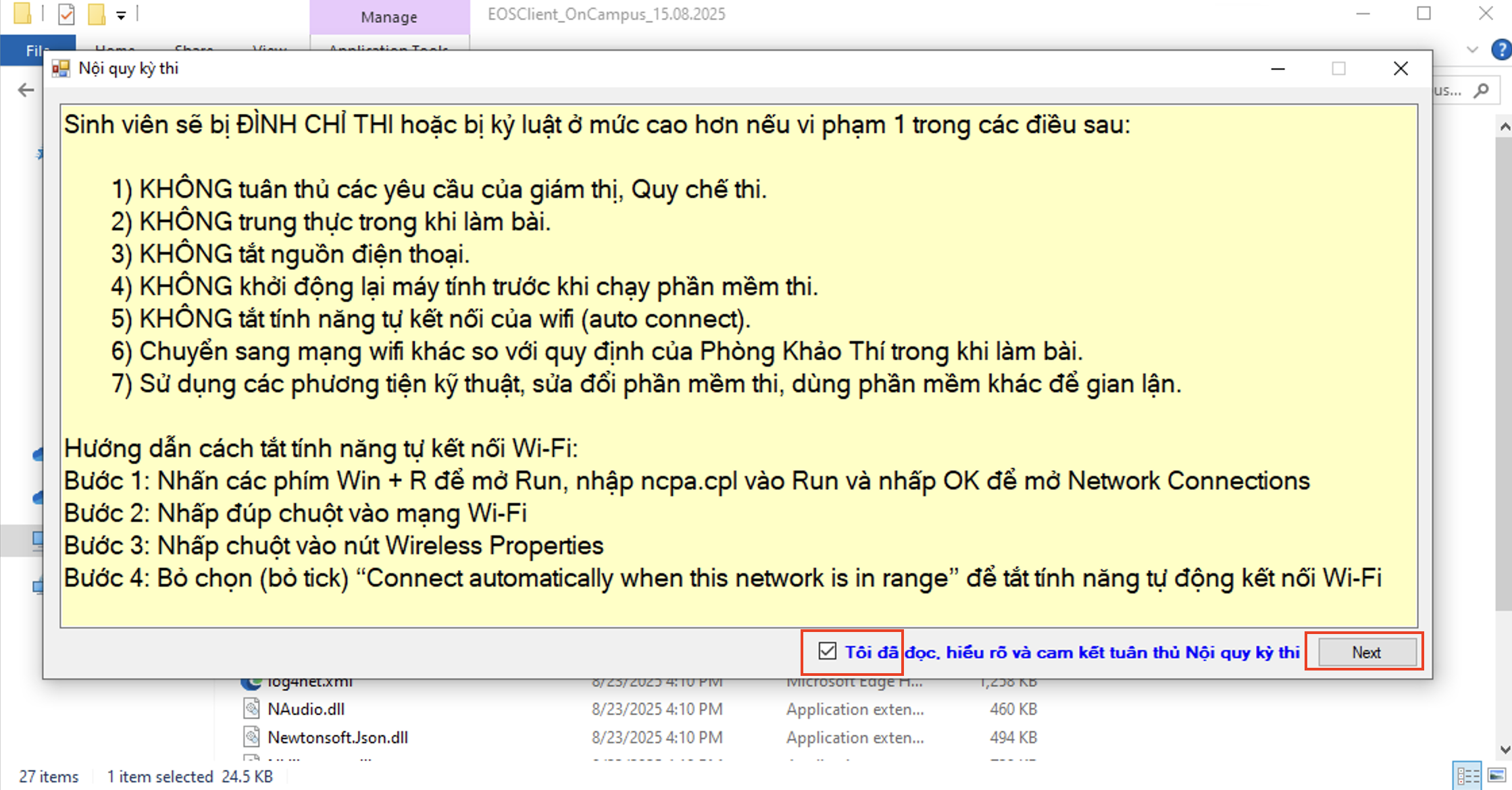 Đọc kỹ nội quy kỳ thi, ấn xác nhận và “Next“